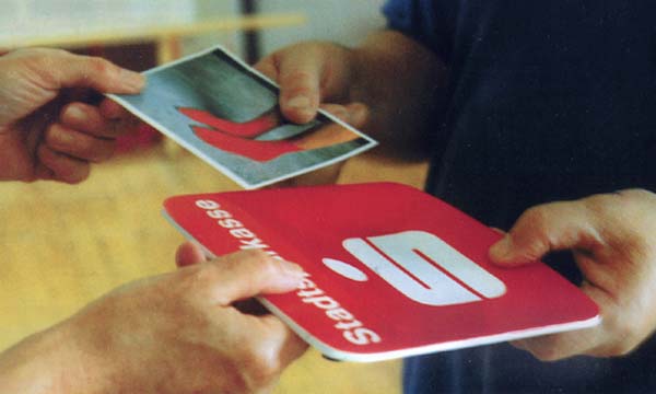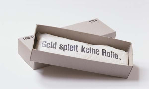 Für die Ausstellung »Kunst und Geld« entwickelte Susanne Maaß ihre erste Tauschaktion. Über drei Monate tauschte sie den überall gegenwärtigen roten Wechselgeldteller aus Kunststoff mit dem weißen »S« der Stadtsparkasse gegen Gegenstände und Dienstleistungen ihres alltäglichen Bedarfs: »bezahlte« so ihre Schuhreparatur, »kaufte« Wein, Brot, Zeitung, Kunstmaterial und auch Kunst, ging ins Theater und Konzert. Der Teller wurde in der Hand von Susanne Maaß zu dem, was er im täglichen Leben nur passiv begleitet, zu Geld. Aber er wurde auch zum Kunstgegenstand: bei jedem Tausch signierte die Künstlerin den Wechselgeldteller auf der Rückseite.